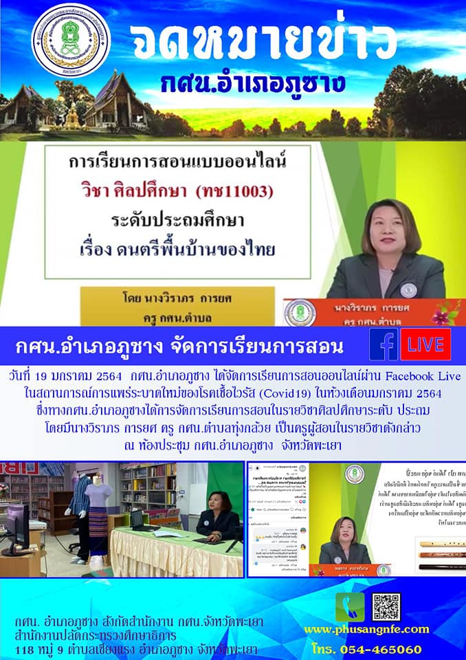 ข่าวหัวเรื่อง : 19 มกราคม 2564 นางวิราภร การยศ ครูกศน.ตำบลทุ่งกล้วยจีดการเรียนการสอนออนไลน์ ช่วงสถานการณ์โควิด 19 ณ กศน.อำเภอภูซาง